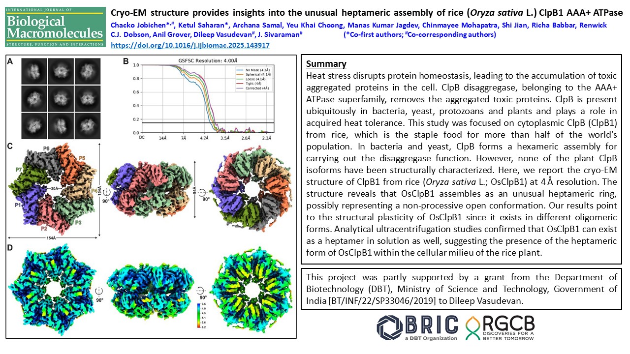 03/May/2025: Our second cryo-EM paper is also out! Our work on the Rice ClpB1 heptamer structure by cryo-EM has been published in the International Journal of Biological Macromolecules. The work involved extensive collaborative efforts.