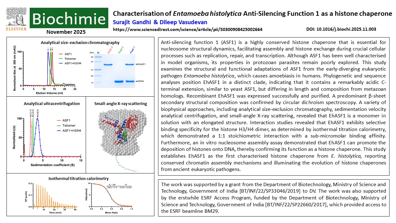 10/November/2025: Biochimie paper! Surajit’s manuscript titled ‘Characterisation of Entamoeba histolytica Anti-Silencing Function 1 as a histone chaperone’ has been accepted for publication in the French Society journal – Biochimie.