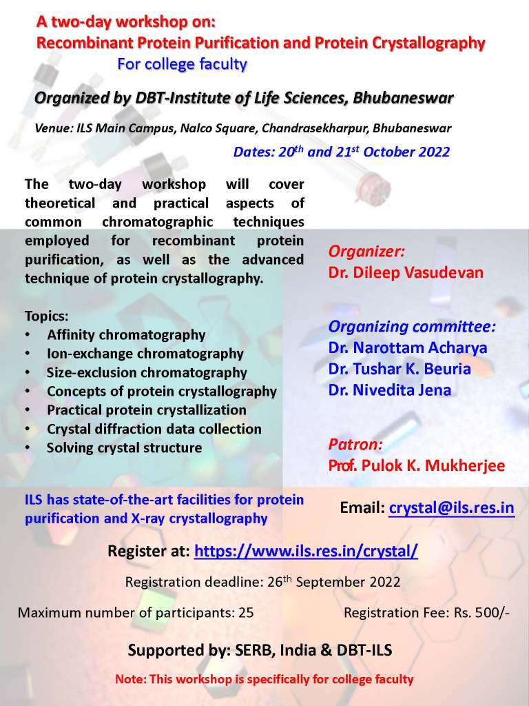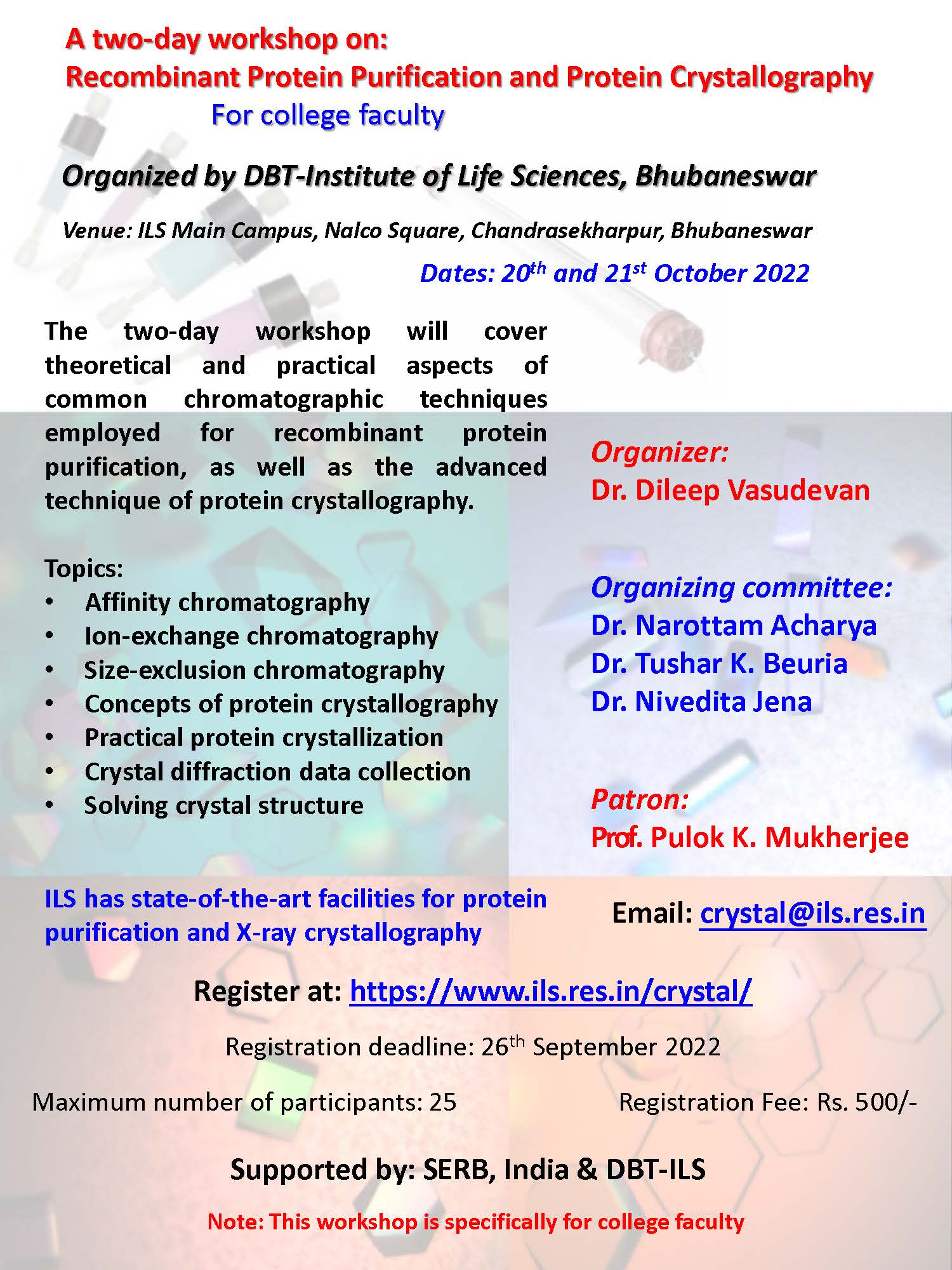 05/September/2022: We are organizing a workshop @ILS. Our first! A two-day workshop on “Recombinant Protein Purification and Protein Crystallography” is being organized at ILS for college faculty. Details can be seen below.